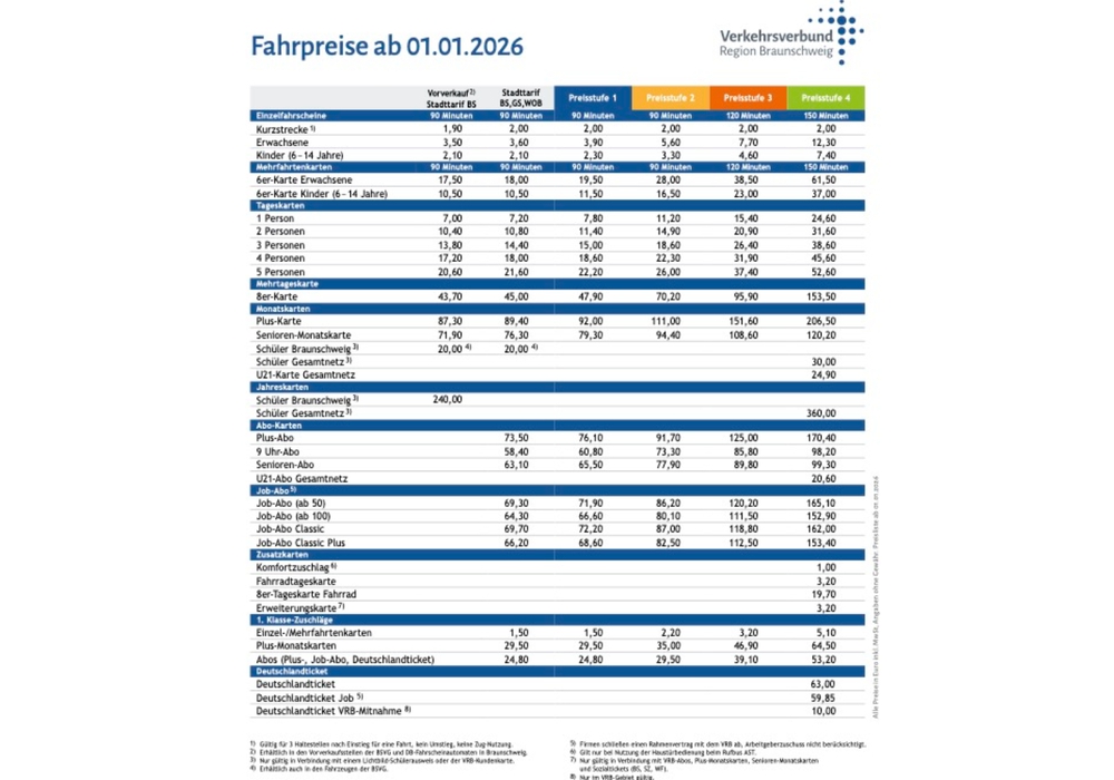 Region. Zum 1. Januar 2026 steigen die Ticket-Preise im ÖPNV im Gebiet des Verkehrsverbundes Region Braunschweig (VRB) - dem sämtliche Landkreise und kreisfreien Städte unserer Region angehören - durchschnittlich um 4,8 Prozent. Das berichtet der VRB in einer Pressemitteilung.