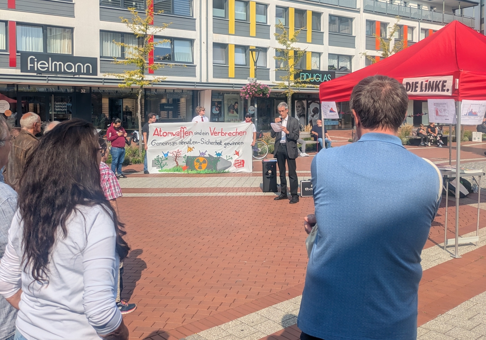 Knapp über 20 Teilnehmer hörten den Redebeiträgen von Vertretern der Linkspartei und IPPNW Braunschweig zu, in welchen auch Bezug auf die heutige nukleare Bedrohungslage genommen wurde. Dabei sprachen sich die Redner für eine Ächtung und ein Verbot von Atomwaffen und für globale Abrüstung aus, sowie eine außenpolitische Kehrtwende hin zu mehr Diplomatie.