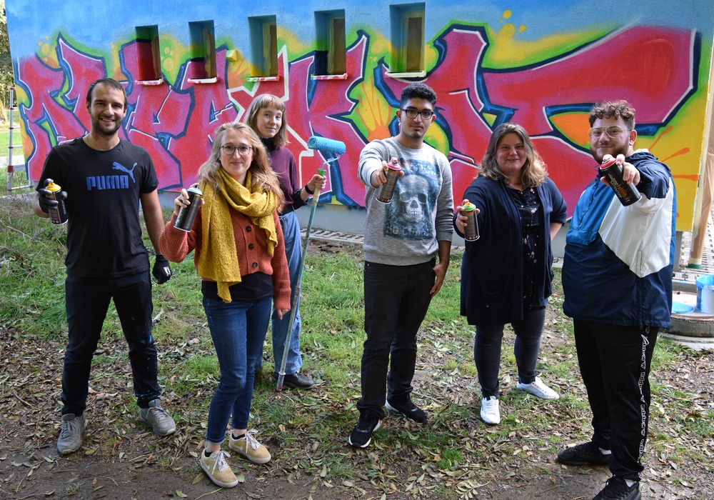 Ehrenamtlich arbeiten seit Anfang Oktober zwei Sprayer und eine Sprayerin: Nach der Zusage von Marvin Pflug wurden für die Sprayaktion Elisa Mazanec und Nico Thiermann gewonnen, die nach ihrer Arbeit/ihrem Studium in ihrer Freizeit sprayen und auch die Besuchenden mal probehalber auf kleinen Flächen mitmachen lassen. „Wir freuen uns über das Interesse der Besuchenden“, sagt Nico Thiermann, der zurzeit an der Motto-Wand arbeitet, an der abschließend der Name „Graffiti“ gesprayt werden soll.