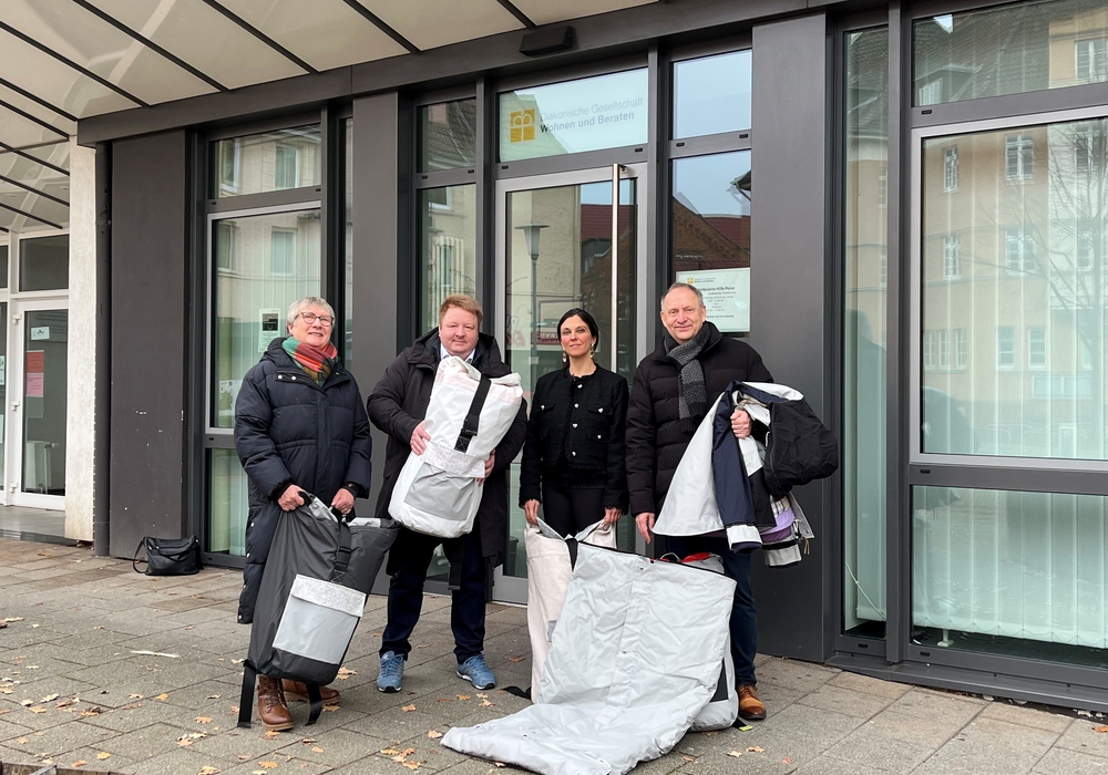 Freudig nahmen die Sozialarbeiterinnen Bärbel Schuster und Jenny Thiele-Meier von der Ambulanten Hilfe, die zur Diakonischen Gesellschaft Wohnen und Beraten gehört, die Sheltersuits in Empfang. Sie berichteten Bürgermeister Klaus Saemann und Marc Wegner von ihrer täglichen Arbeit, von den Herausforderungen und von den prekären Nöten der Betroffenen. „Peine kann sich glücklich schätzen, dass es hier Institutionen und Menschen gibt, die sich diesen Aufgaben stellen und diese benötigen jegliche Unterstützung“, unterstreicht Saemann die Bedeutung der Ambulanten Hilfe.