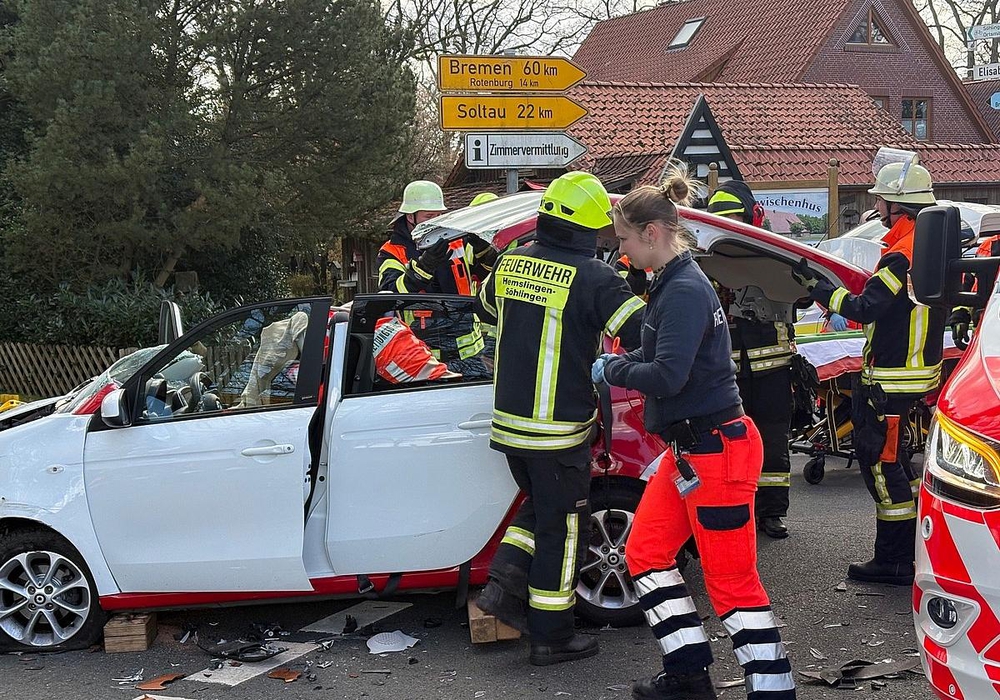 Für eine patientenschonende Rettung mussten die Feuerwehrkräfte das Dach und die Beifahrertür des Smart entfernen. Zu den Rettungsarbeiten wurden neben der Ortsfeuerwehr Hemslingen auch die Feuerwehren aus Bothel und Westerwalsede nachalarmiert. Die Straßen waren zeitweise gesperrt.