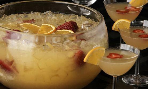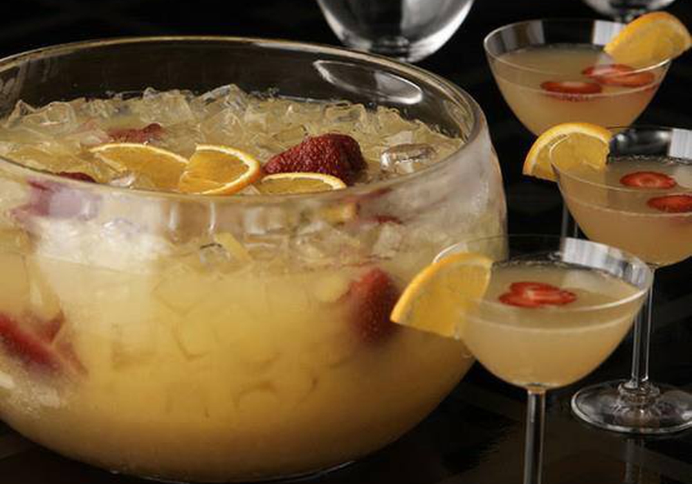 2 Liter frisch gepressten Orangensaft 2 Liter Ginger Ale 1/2 Tasse Orangenlikör (Grand Marnier) Orange Scheiben Frische Erdbeeren, in Scheiben geschnitten oder halbiert werden, je nach Größe 1 (750 ml) Flasche gekühlten Champagner oder trockener Sekt Eiswürfel Ein Rezept von www.justapinch.com