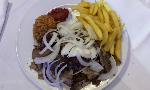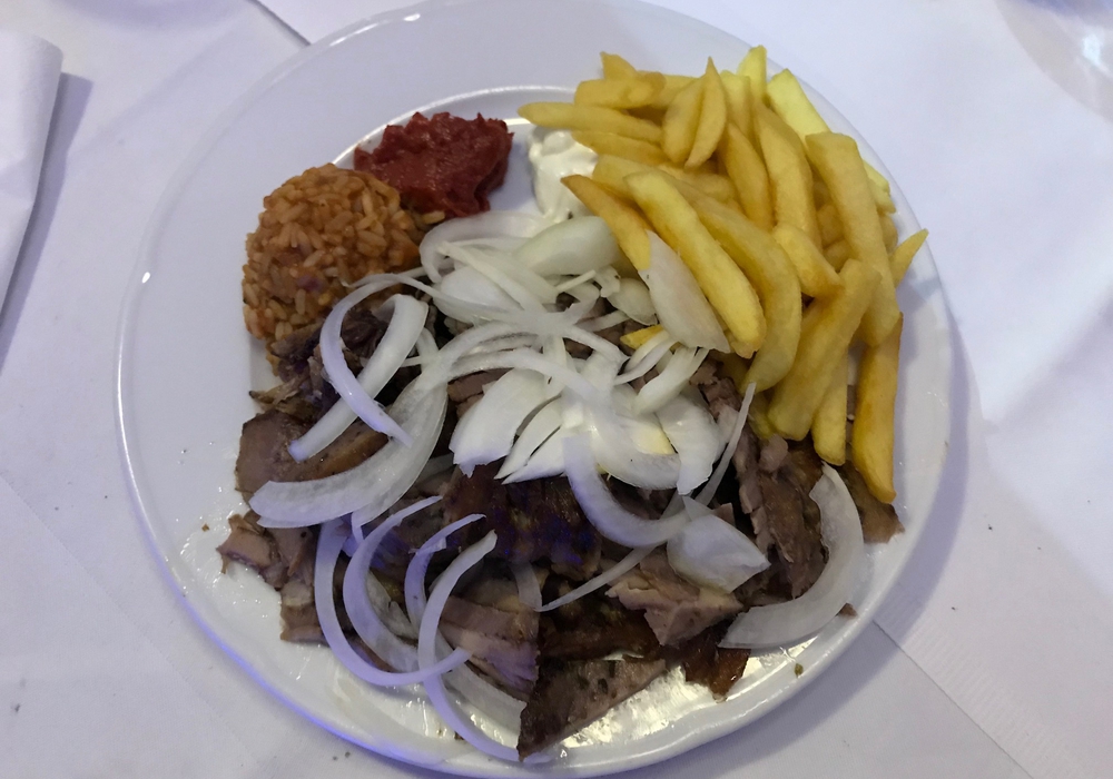 Zum Testessen haben wir uns entschieden, bei Klassikern zu bleiben und bestellten einen ganz normalen Gyros-Teller. Oft finden wir das Schweinefleisch vom Drehspieß zu trocken. Ganz anders im Elena. Nicht verbrannt, gut gewürzt und saftig stand es mit knusprigen Pommes frites und tomatisierten Reis vor uns. Es roch gut und es schmeckte gut! Dazu ein Löffel Zaziki und ein bisschen Ajvar, dieses rote kalte Paprikamus, dass in Griechenland gern zu Fleisch gereicht wird. Der Preis für 8,90 Euro in keinster Weise zu beanstanden.