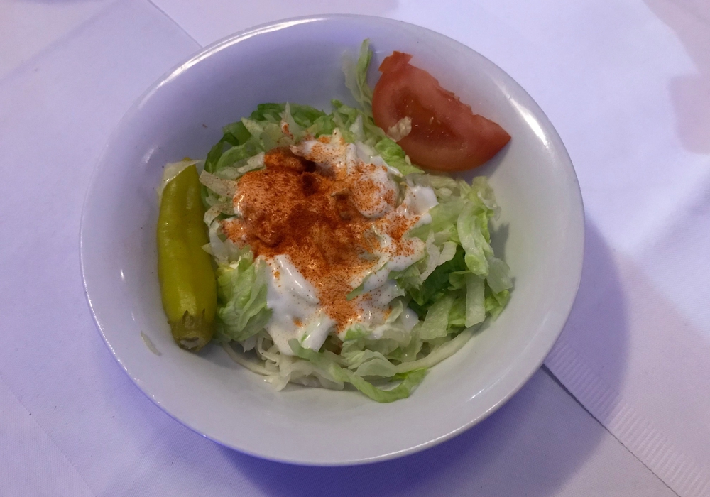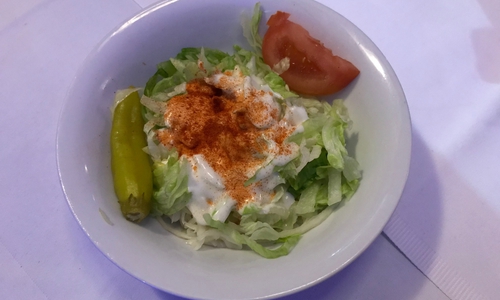 Zum Hauptgang, aber vom zeitlichen Ablauf auch als zweite Vorspeise genießbar, wurde ein mit Eisbergsalat, Peperoni und Tomate aufgepeppter Krautsalat gereicht. Die Joghurtsoße wurde mit rotem Paprikapulver veredelt. Geschmacklich gut.