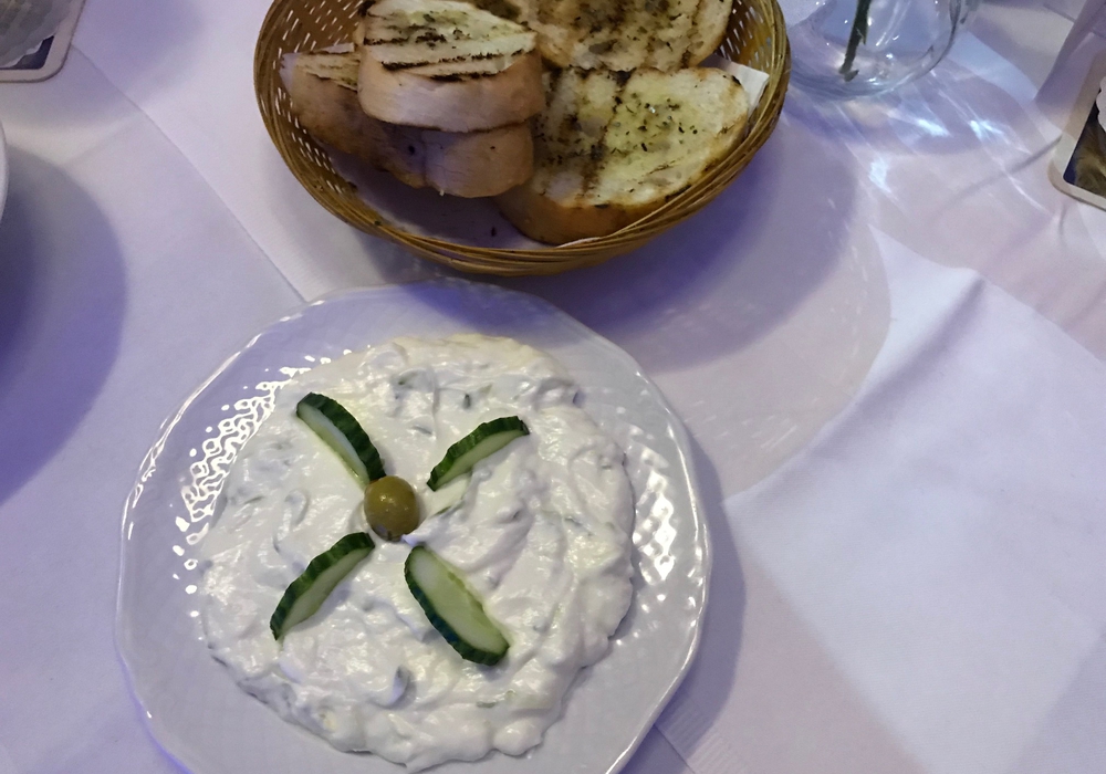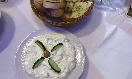 Ouzo gratis vorweg, der Klassiker. Reichliche Auswahl an wirklich griechischen Spezialitäten in der folierten Speisekarte. Sehr freundliche und aufmerksame Bedienung. Als Vorspeise bestellten wir einen weiteren Klassiker: "Zaziki", also eine Joghurtspeise mit Gurken und Knoblauch. "Aus eigener Herstellung", so das Versprechen der Küche, das voll erfüllt wurde. Sehr schmackhaft, stimmig gewürzt und mit gegrilltem Kräuterbrot gereicht. Industrielles Zaziki schmeckt wahrlich anders! Der Preis liegt mit 3,80 Euro in einem völlig normalen und erwartbaren Bereich.