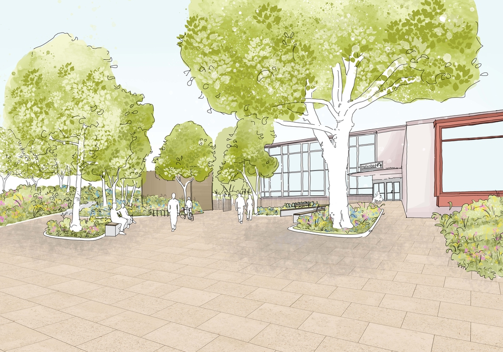 : Eingang in den Kleistpark aus Richtung Kaufhof kommend - auf diesem Bereich liegt ein Fokus der Umgestaltung. Foto: Visualisierung: Stadt Wolfsburg