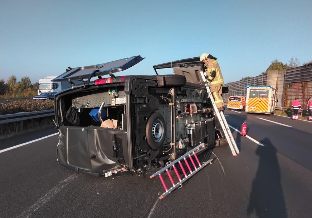 Der Unfall ereignete sich, als der Fahrer des Transporters von der mittleren auf die linke Spur gewechselt ist, teilt die Polizei in einem Update mit. Dieser habe ein von hinten herannahendes Auto übersehen, sodass es zur Kollision kam. Der Transporter kippte in Folge des Zusammenstoßes auf die Seite. Beide Fahrer wurden leicht verletzt.