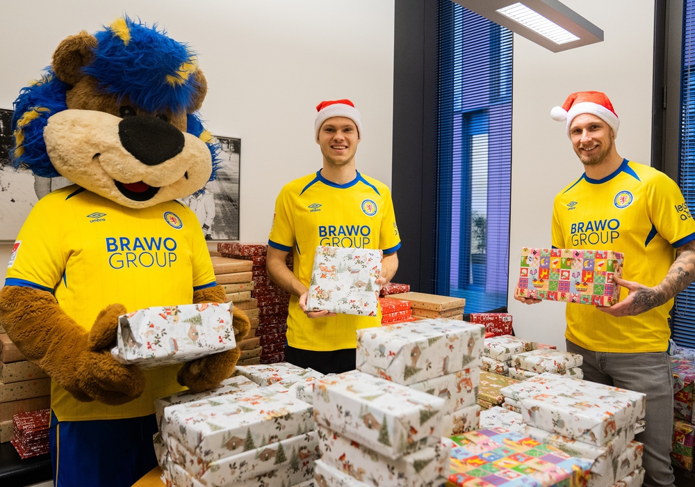 Im festlichen Rahmen trafen sich die fleißigen Helferinnen und Helfer, um die zahlreichen Päckchen liebevoll zu verpacken. In diesem Jahr bekamen sie dabei ganz besondere Unterstützung: Zwei Spieler von Eintracht Braunschweig, Louis Breunig und Sebastian Polter, sowie das Maskottchen Leo legten selbst die Hände an und halfen tatkräftig beim Einpacken.