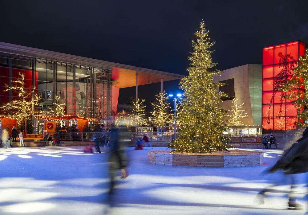 Das Herz der Winterwelt bildet die 4.000 Quadratmeter große Eisfläche, auf der Gäste täglich von 10 bis 22 Uhr ihre Runden drehen können. Wer keine eigenen Schlittschuhe mitbringt, kann sich vor Ort ein Paar für 5 Euro leihen. Wenn die Dämmerung einsetzt, wird die Eisfläche von Sonntag bis Donnerstag zur Eisdisco mit einem Musik-Mix aus den 70ern bis heute.