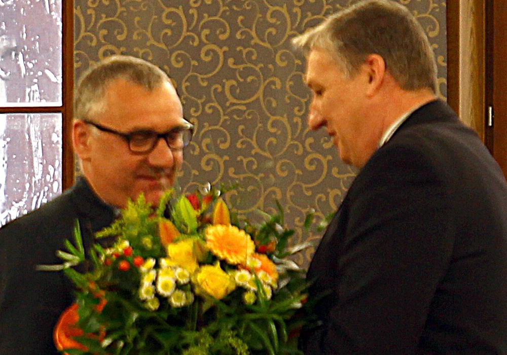 Von Oliver Ganzauer (r.) gab es für Thomas Boog zum Abschied Blumen.">Von Oliver Ganzauer (r.) gab es für Thomas Boog zum Abschied Blumen. Foto: