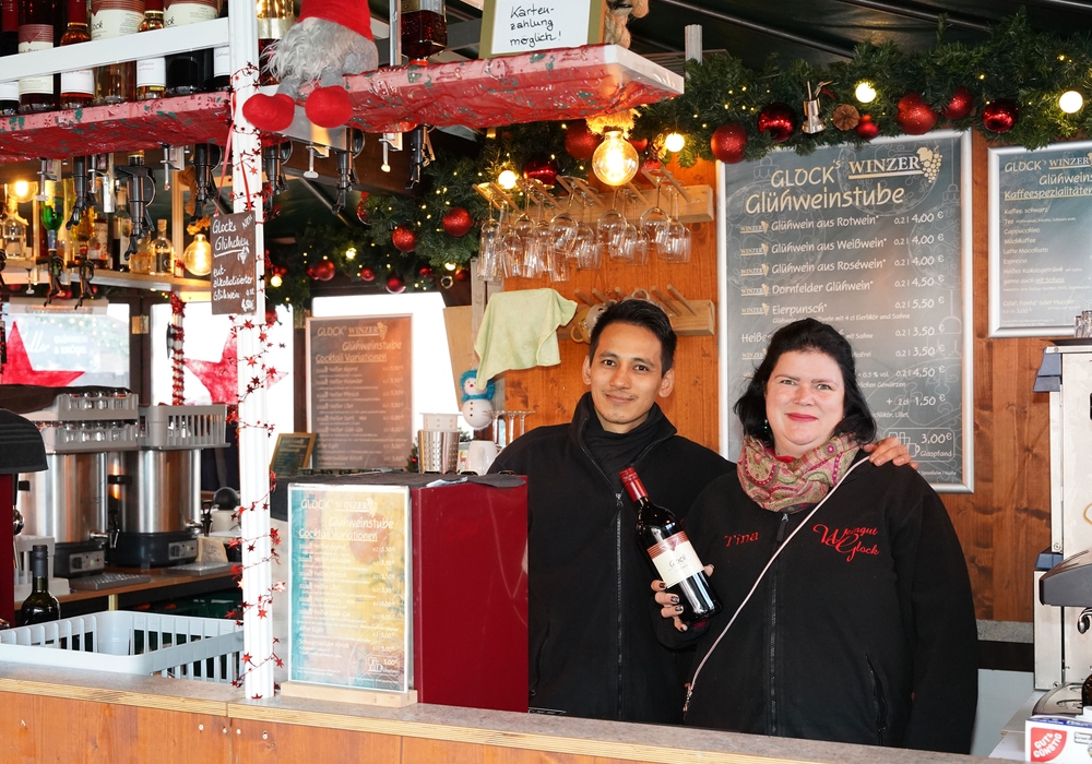 Moses und Tina von Glock’s Winzer-Glühweinstube freuen sich über das großzügige Platzangebot. Manche Gäste würden sich am Wochenende aber längere Öffnungszeiten wünschen. Foto: Matthias Kettling