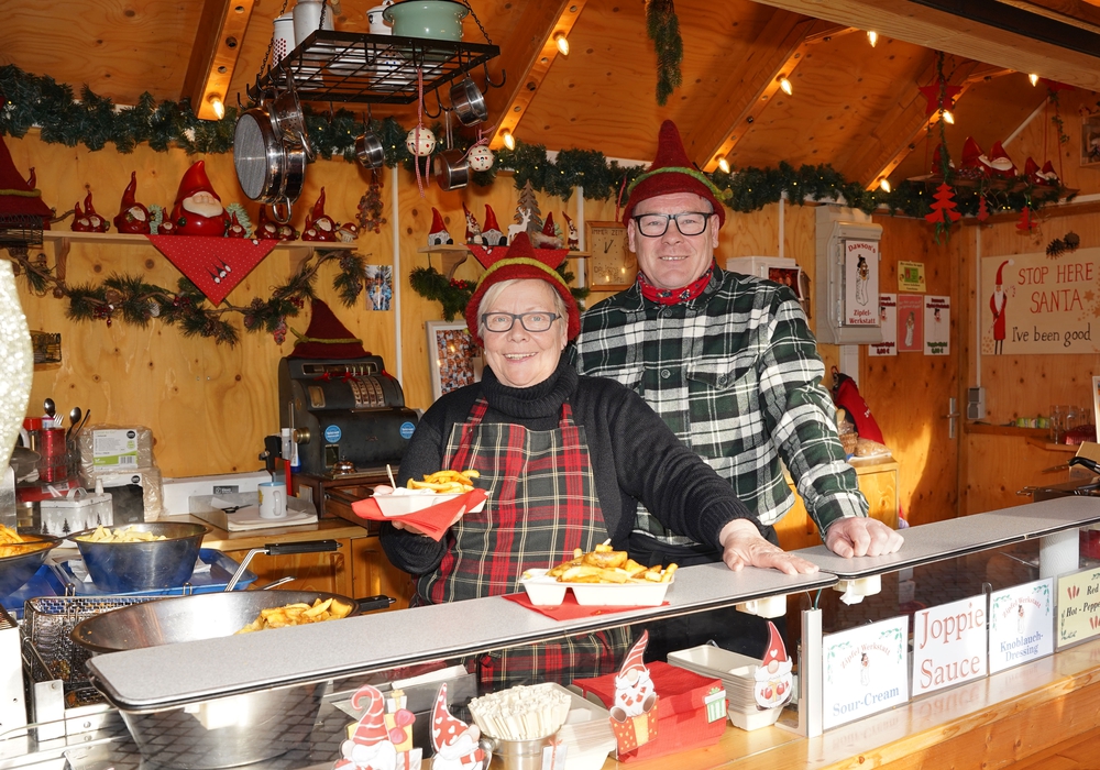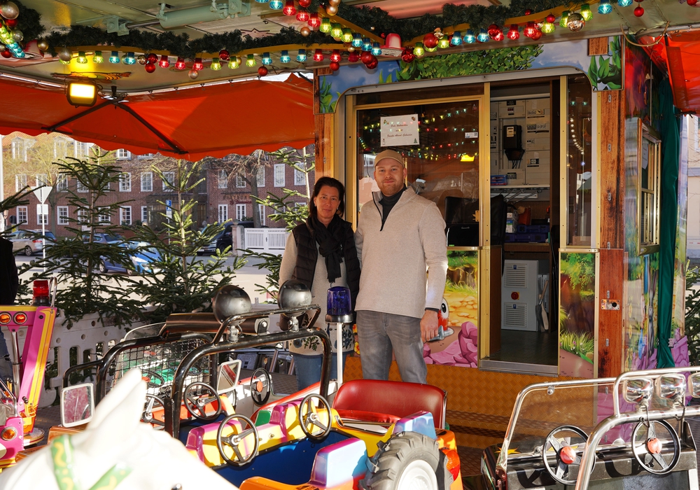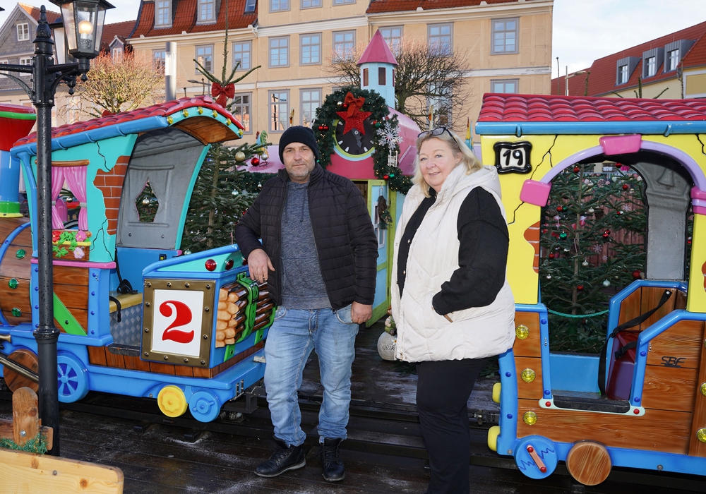 Daniela Ahrend und Manfred Vorlop freuen sich auf die jüngsten Besucher in ihrem Kinderkarussell. Sie sind wie immer sehr zufrieden mit dem bisherigen Verlauf des Weihnachtsmarktes. Foto: Matthias Kettling