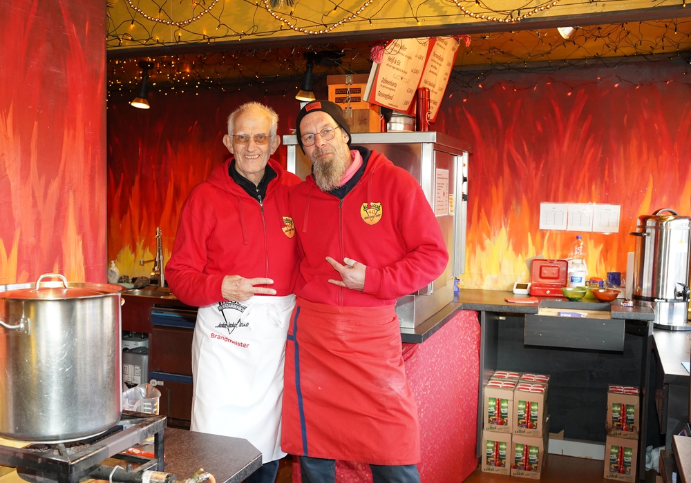 Hajo Palm und Toto Bode von der Feuerzangenbowle finden es immer schön, mit den Menschen hier zu tun zu haben. "Wunderbar, gute Stimmung, gutes Wetter!" Foto: Matthias Kettling