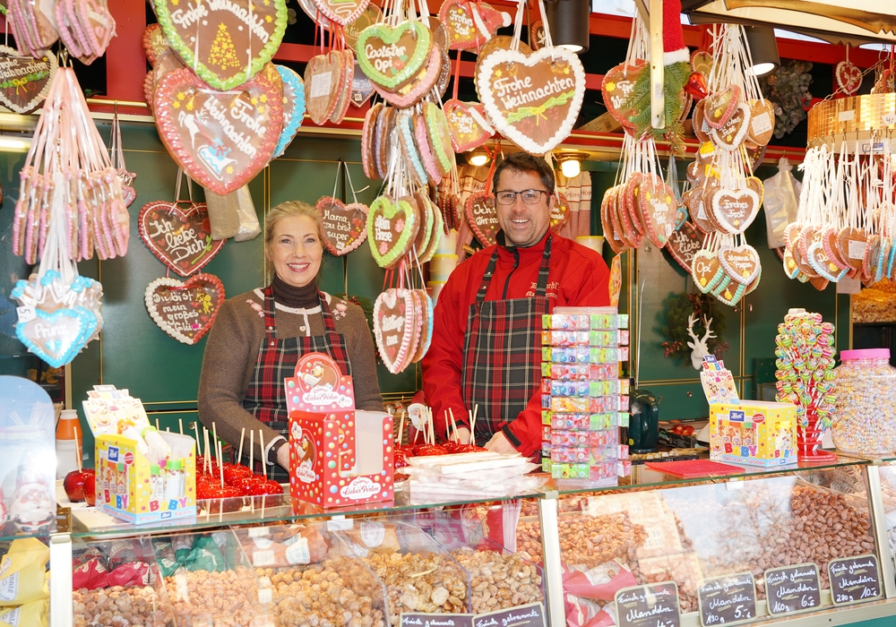 Anja Dannehl und Timo Schulze von der Mandelbrennerei Dannehl freuen sich, dass es wieder etwas kühler wird. Sie finden die Kulisse vor dem Schloss besonders schön. Foto: Matthias Kettling