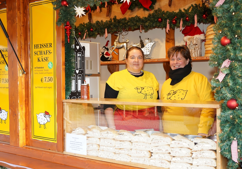 Mona Hoppe (links) und Sandra Reh verkaufen heißen Schafskäse im Fladenbrot und freuen sich über den bisherigen Verlauf. Foto: Matthias Kettling