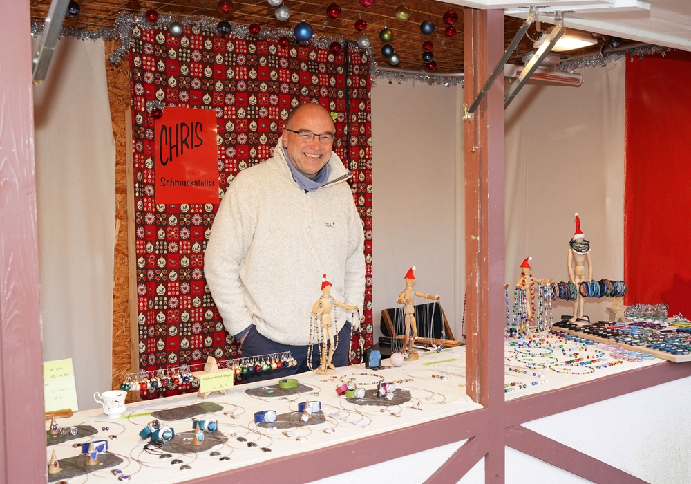 Christoph Stengel findet es gut, dass auf dem Schlossplatz viel Platz ist. Mit seinem Schmuckatelier ist er schon seit 15 Jahren dabei. Sehr fair findet er außerdem die Unterstützung der Stadt Wolfenbüttel, die die Buden stellt und er nur dekorieren muss. Foto: Matthias Kettling