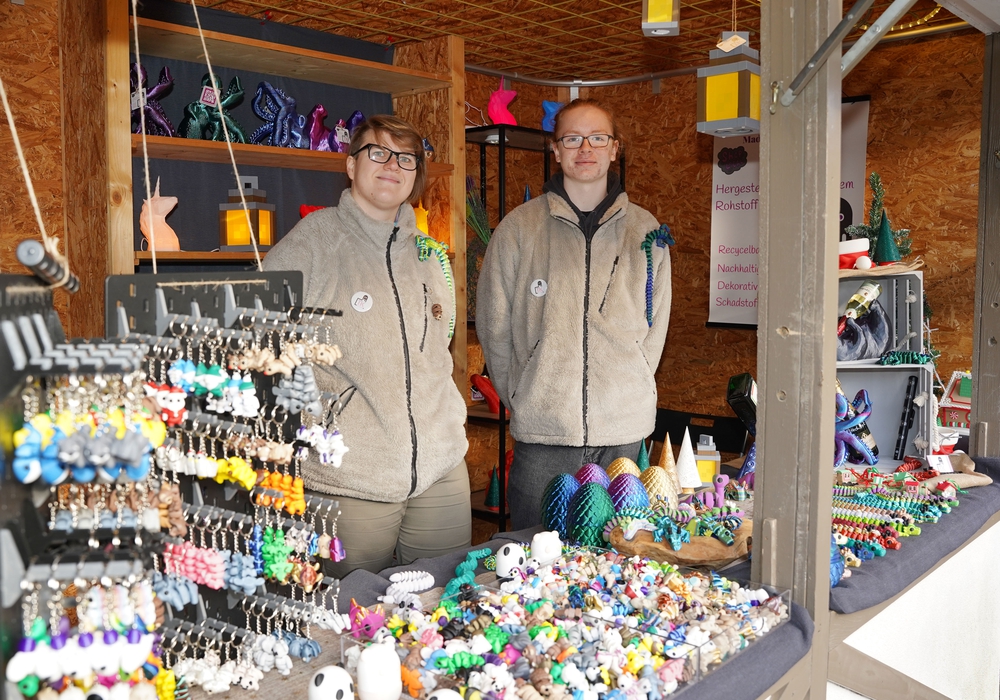 Chantalle Piraks und Ferdinand Mohrmann verkaufen 3D-Drucke. Sie sind erst seit Dienstag auf dem Weihnachtsmarkt und freuen sich besonders über die nette Kundschaft. Auch sie könnten sich etwas längere Öffnungszeiten gut vorstellen. Foto: Matthias Kettling