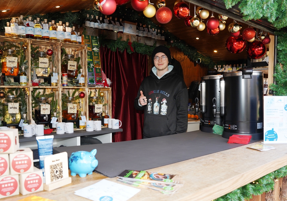 Die Tabby Gin Glühhütte ist zum ersten Mal auf dem Wolfenbütteler Weihnachtsmarkt vertreten. Max Steen vom Kochmal-Team aus Braunschweig ist sehr zufrieden mit den Besucherzahlen. Foto: Matthias Kettling