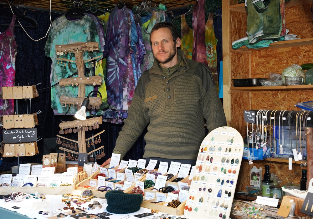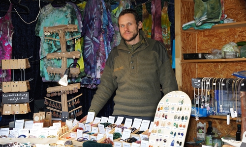 "HippieKing" Alexander Schack verkauft Batik, Edelsteine und Holzschmuck und hat die Hütte für drei Wochen gemietet. Foto: Matthias Kettling