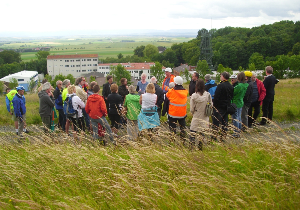 Zuerst ging es auf eine Anhöhe, von der das Betriebsgelände der Schachtanlage gut zu überblicken ist. Der Geschäftsführer der Asse-GmbH erläuterte die Funktion der einzelnen Gebäude, die weiteren Baumaßnahmen und wie sich das Grubengebäude erstreckt. Es schloss sich eine Diskussion zur Notfall-Planung, zur Notwendigkeit der weiteren Erkundung der Geologie der Asse, zum zusätzlichen Schacht 5 und zur Zwischenlagerplanung an. Einen unmittelbaren und nicht alltäglichen Eindruck über die Arbeiten der Asse-GmbH konnten die Teilnehmer am Bohrplatz für die Erprobungsbohrung für den geplanten Schacht 5 gewinnen.