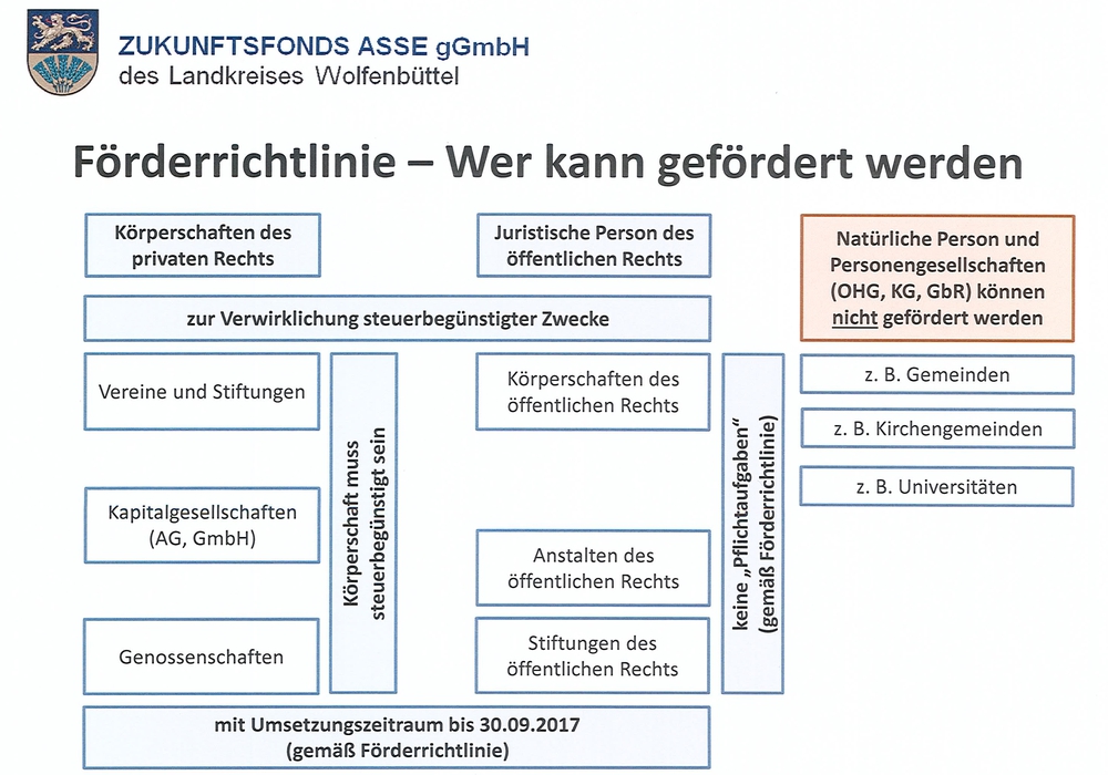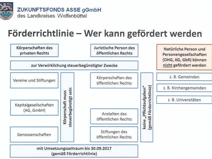 Remlingen. Die erste Million aus dem Assefonds für das Jahr 2014 ist an den Landkreis Wolfenbüttel überwiesen worden. Nun können Projekte gefördert werden. Welche Projekte können gefördert werden? Wer kann Anträge stellen? Wo, ab wann und in welcher Form können Anträge gestellt werden? Antworten auf diese und andere Fragen wird es in einer öffentlichen Informationsveranstaltung am Dienstag, 5. Mai, ab 17 Uhr im Dorfgemeinschaftshaus Remlingen geben.