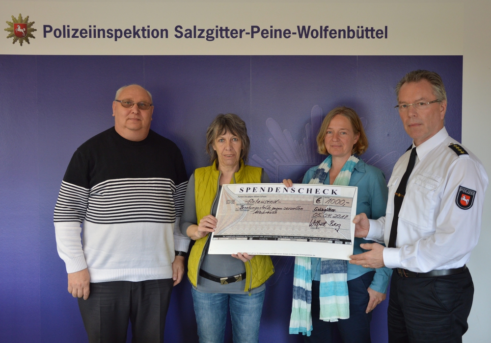 Bernd Penczok (International Police Association), Ulrike Hennies (Beratungsstelle gegen sexuellen Missbrauch), Karen Westphal (Beratungsstelle gegen sexuellen Missbrauch) und Wilfried Berg (Leiter der Polizeiinspektion Salzgitter/Peine/Wolfenbüttel) (v. li.). Foto: Polizei