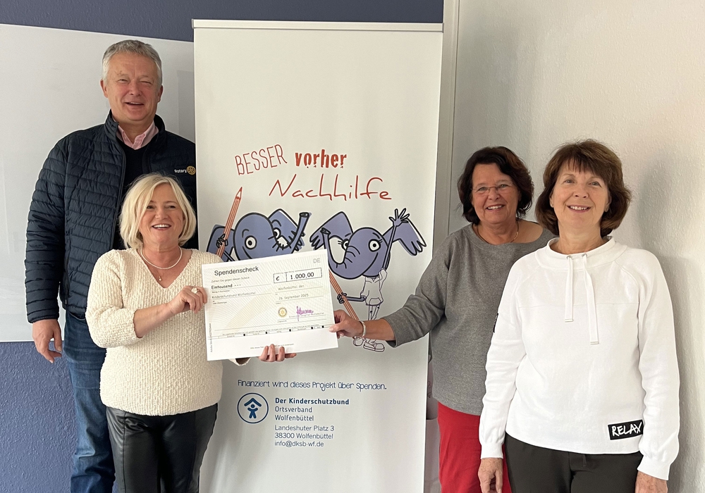 Wolfenbüttel. Der Rotary Club hat dem Kinderschutzbund Wolfenbüttel 1.000 Euro für das Projekt „Besser vorher Nachhilfe“ gespendet. Diese Initiative soll Grundschulkinder frühzeitig durch professionelle Nachhilfe beim Aufholen von Lernrückständen unterstützen, bevor sich größere Wissenslücken entwickeln könnten, teilt der Club in einer Pressemeldung mit.