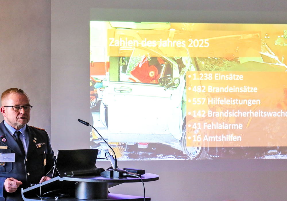 Stadtbrandmeister Olaf Glaeske hob die zentrale Rolle der Freiwilligen Feuerwehr hervor. Die Einsatzkräfte leisten ihren Dienst vollständig ehrenamtlich und investieren viel Zeit in Ausbildung, Übungen und Einsätze – oft unter schwierigen Bedingungen.