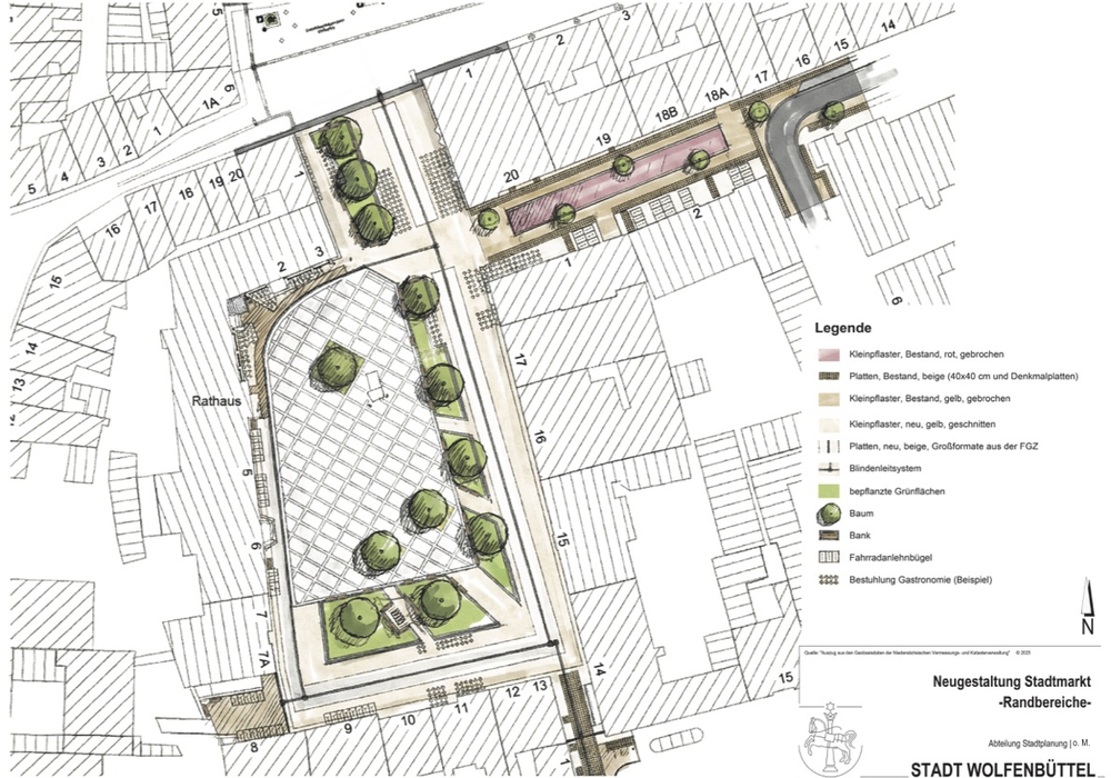 Über zehn Jahre nach den letzten Bestrebungen hätten sich die stadtgestalterischen Ziele zur Umgestaltung des Stadtmarktes weiterentwickelt. Der zur Fußgängerzone umgestaltete Platz solle neben seiner barrierearmen Umgestaltung auch gut ausgeleuchtet werden. Zudem seien Grünflächen im Sinne der Klimafolgeanpassung zu integrieren. Die unterschiedlichen Nutzungsbedarfe seien zu berücksichtigen, wobei die zentrale Fläche wegen ihrer identitätsstiftenden Wirkung und Qualität, aber auch aus wirtschaftlichen Gründen erhalten bleiben soll.
