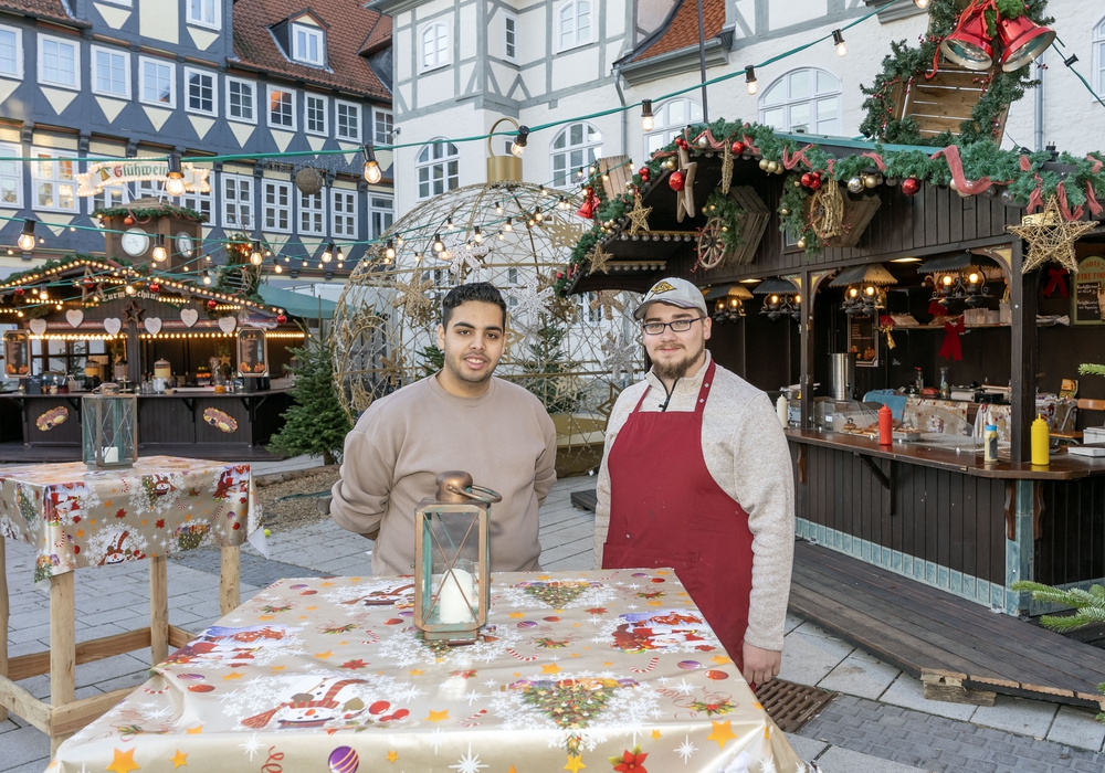 Rony SaryAldeen und Jan-Niclas Hoppe arbeiten im Ausschank (Turm-Schänke) und im Imbiss auf dem Platz vor der Seeligerbank. Bisher läuft es besonders mittags und abends gut, da viele Fußgänger vorbeikommen. "Zumindest an den Wochenenden könnte aber ruhig eine Stunde länger geöffnet sein, wenn es nach den Kunden geht", meint Hoppe.