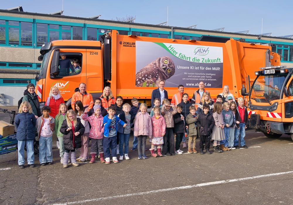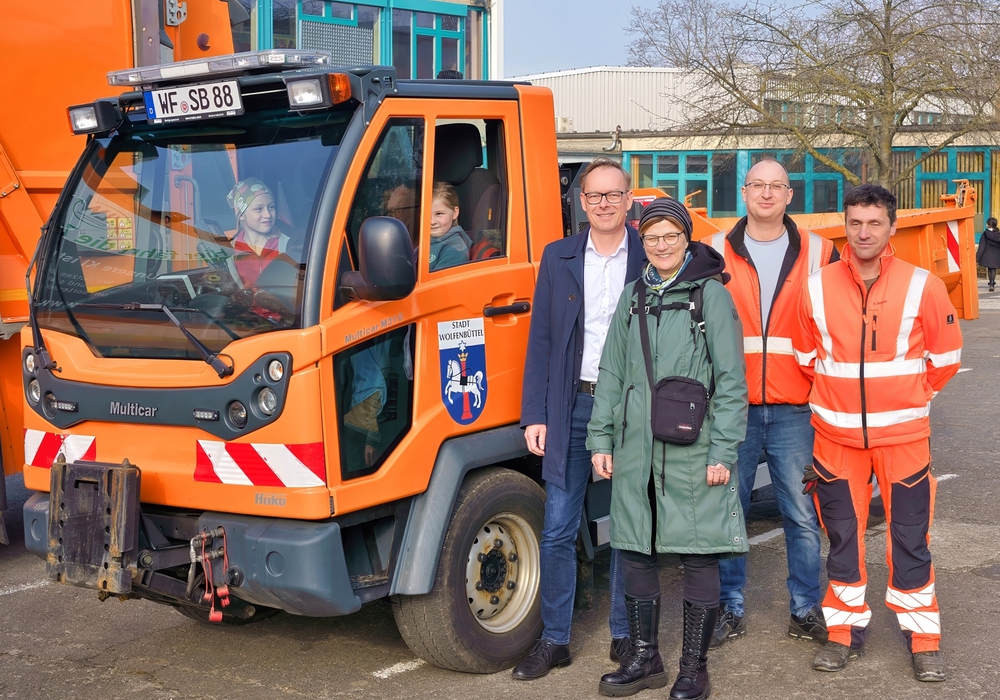 Die Kinder der Wilhelm-Busch-Grundschule bekamen Säcke und Handschuhe für den Stadtputztag. V.l.: Martina Münstermann-Kreifels (Stadt Wolfenbüttel), Nadja Kühn (Wilhelm-Busch-Grundschule), Cord Rohloff, Sandra Wehr (beide ALW), Stadtbaurat Klaus Benscheidt, Patrick Jozwiak, Andreas Jess ( beide Stadt Wolfenbüttel) und Claudia Rudat (Schulleiterin Wilhelm-Busch-Grundschule), im Vordergrund und in den Fahrzeugen Kinder der Wilhelm-Busch-Grundschule Foto: Stadt Wolfenbüttel