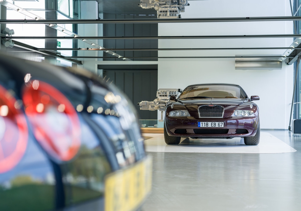Entworfen von Giorgetto Giugiaro, verkörpert der Bugatti EB 118 (1998) mit seinem 18-Zylinder-Motor die erste konkrete Vision für die „Wiederbelebung“ der Marke im Volkswagen Konzern. Ergänzend dazu wird der Motor des EB 218 gezeigt – er bildete die technische Grundlage für die späteren Serienmodelle.