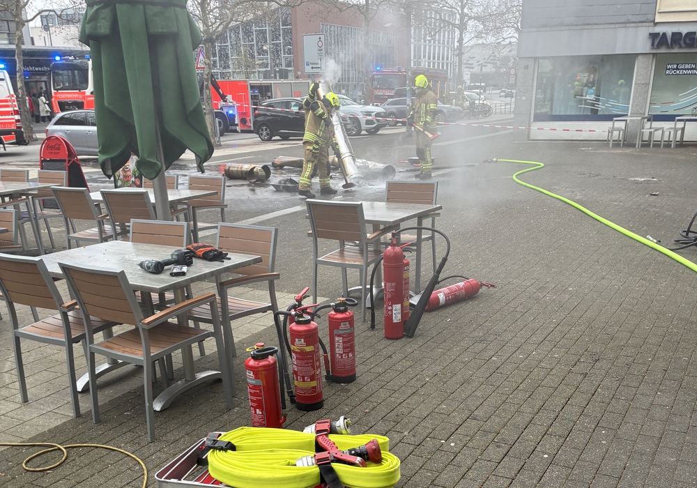 In der nördlichen Porschestraße habe es laut Angaben der Polizei in einem Imbiss gebrannt. Dort habe ein Abzugsrohr Feuer gefangen. Laut Bericht der Feuerwehr sei es in der Abluftanlage zu einem Fettbrand gekommen. "Das brennende Fett sowie die besondere Bauweise der Abluftanlage forderten die Einsatzkräfte." Die Feuerwehr berichtet zudem, dass schwarzer Rauch aus dem Restaurant austrat, der Richtung ZOB zog.
