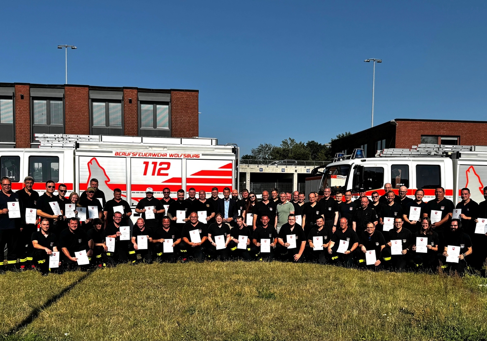 Wolfsburg. Oberbürgermeister Dennis Weilmann hat am vergangenen Samstag 101 Feuerwehrfrauen und -männer der Feuerwehrbereitschaft Wolfsburg mit der Hochwasser-Ehrennadel 2023 des Landes Niedersachsen ausgezeichnet. Die Verleihung fand auf dem Übungsgelände der Feuerwehr in der Borsigstraße statt. Darüber informiert die Stadt Wolfsburg in einer Pressemitteilung.