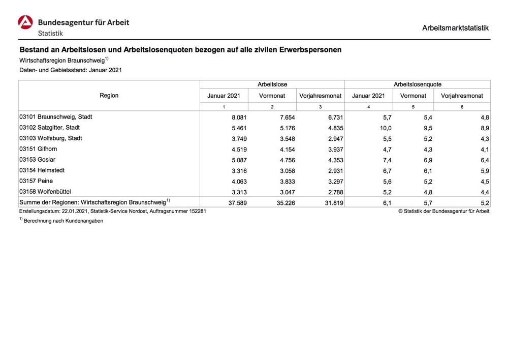 „Die steigenden Zahlen zum Jahresbeginn sind einerseits saisonal üblich und auf die witterungsabhängigen Branchen sowie das Auslaufen von Befristungen zum Jahresende zurückzuführen andererseits sorgt auch der Lockdown für diese Entwicklung. Wir verzeichneten in diesem Monat einen Zuwachs der Arbeitslosigkeit um 7,7 Prozent, in den Vorjahren lagen die Anstiege von Dezember auf Januar bei zirka 6 bis 7 Prozent. Der Anstieg an Arbeitslosen ist also einerseits etwas höher als in den Vorjahren und zum anderen befinden wir uns – krisenbedingt - auf einem deutlich höheren Niveau im Vergleich zum Vorjahr", ergänzt Ulf Steinmann, Leiter der Agentur für Arbeit Helmstedt, die auch den Landkreis Gifhorn und Wolfsburg umfasst.